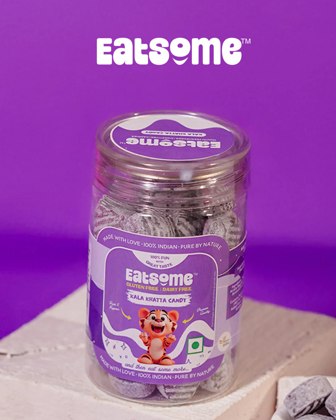 Introducing EATSOME Kala Khatta Candy, the perfect combo of sweet and sour that will have your taste buds dancing! Crafted with Sugar Boiled Confectionery, each candy is wrapped in sweetness and a tart twist of citric goodness, with a dash of Black Salt for that extra tangy kick. The rich flavor of Black Currant takes it to the next level, making this candy a favorite for both kids and adults alike. Whether you're looking for a quick energizer or a delicious treat, Kala Khatta has got you covered. Pop one in your mouth, and let the bold, mouth-watering flavor take charge! Packed with ultimate yum in every bite – it's your go-to candy for any time, anywhere!