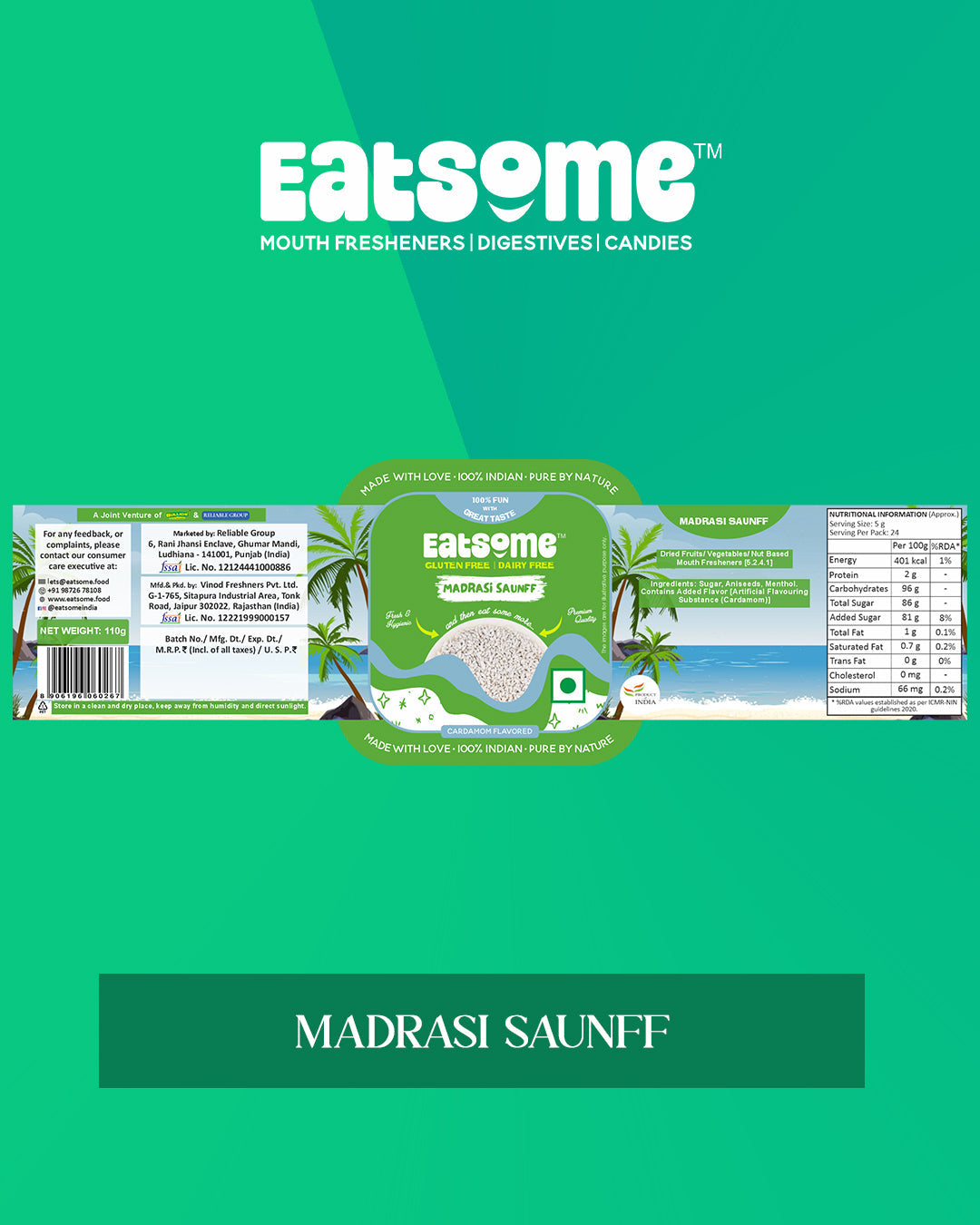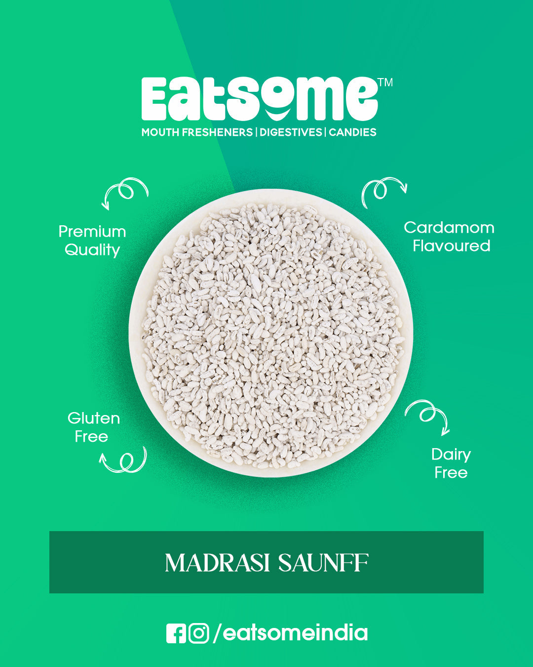 Get ready to treat your taste buds with a burst of freshness and sweetness in every bite of EATSOME Madrasi Saunff, This delightful mouth freshener brings together natural Aniseed, which is packed with fresh, zesty notes, and a perfect blend of Sugar and Menthol to refresh your breath. But wait, the magic doesn’t stop there! The rich essence of Cardamom gives a soothing, aromatic punch that makes